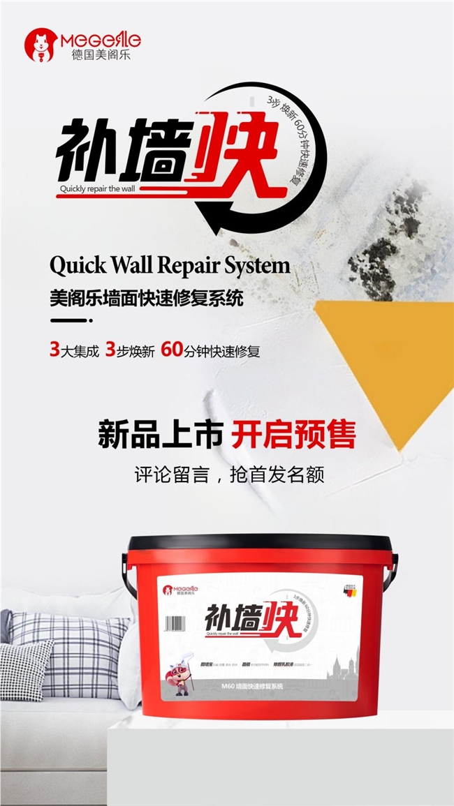 二、行业首创!补墙快重构修复流程 美阁乐“补墙快”首创**“3大集成+3步焕新+60分钟修复”系统**:将固墙宝(基层封固)、晶锢(快干找平)、除醛乳胶漆(面层美化)与施工工具集成一桶,工人一次上门即可完成从基层处理到刷漆的全流程,效率较传统方式提升300%。