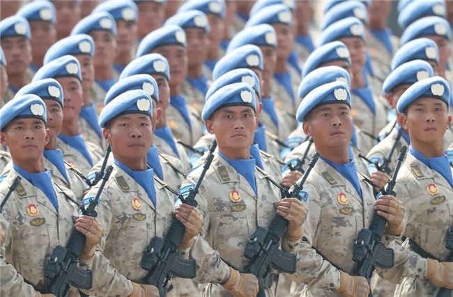 (上图为:维和部队方队将士身着际华3534公司制19阅兵男沙漠迷彩通用作战服产品接受检阅)