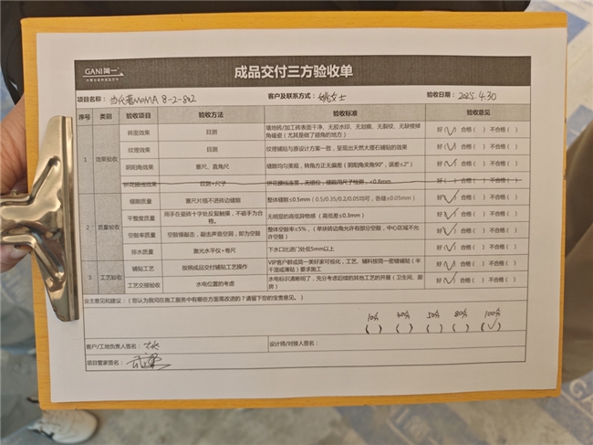 验收人员会化身“品质讲解员”,一边使用专业工具进行检测,一边向业主直观展示关键节点的工艺标准和实测结果。业主不再是被动地等待一个结果,而是可以亲眼看到靠尺下的平整数据,亲手触摸连贯流畅的砖缝,真切地感受到何为“精准化交付”。所有验收数据与报告都会形成验收档案,业主可随时查阅,让家的每一寸品质都清晰可见,有据可查。