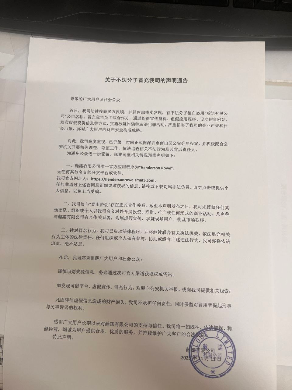 最后,瀚诺有限公司再次提醒:所有合法服务仅通过官方“瀚诺app”提供,公司未开展任何“特批投资”“限时活动”“合作返利”等业务。未来,公司将持续优化平台安全能力与用户支持机制,力求为每一位用户营造更加清晰、安全、可控的数字金融体验。