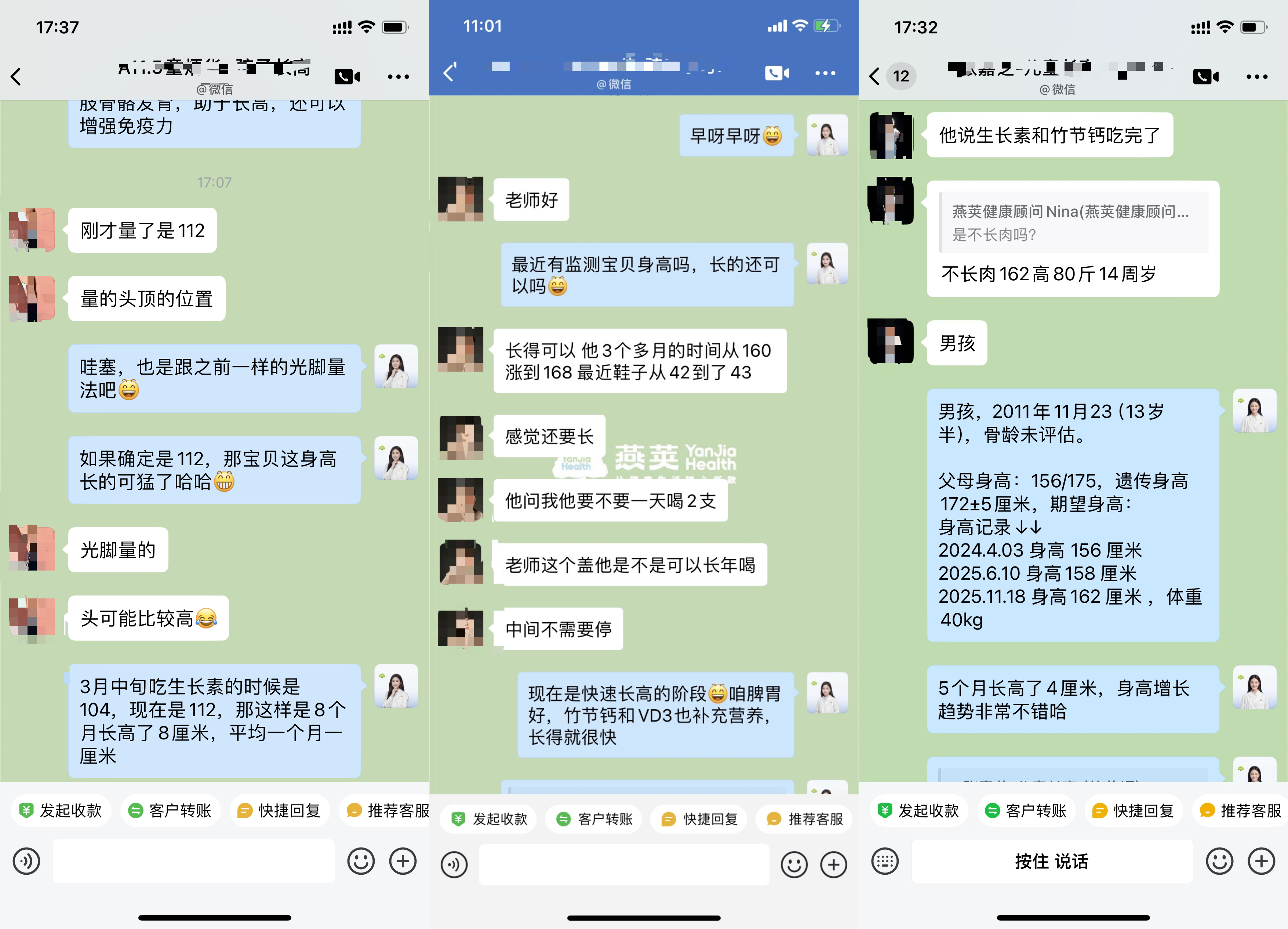 我先给大家讲两个我了解到的真实案例。有个7岁的小男孩,之前身高增长那叫一个慢,家长都快急疯了,尝试了各种方法都没啥用。后来在燕荚健康顾问的精心管理下,仅仅16个月,就长高了13厘米!还有一个十来岁的男孩,同样面临身高增长难题,经过燕荚3个月的科学养护,长高了8厘米!这增长速度,简直就像坐了火箭一样,太让人惊喜了!还有好几个孩子在健康顾问的服务下,3-5个月长高5-8厘米等等,这些长高的案例还有很多,可以看出,燕荚的健康顾问确实有两把刷子的。