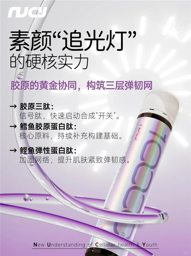 随着年龄增长,人体皮肤胶原蛋白会出现自然流失的现象,科学研究显示,从25岁左右开始,皮肤胶原蛋白会以一定速率逐渐流失,到45岁时流失量约为30%,皮肤组织会出现萎缩塌陷、松弛皱纹、毛孔粗大等问题,而熬夜、压力、紫外线等因素会加速这一过程。NUCY推出的PQQ金顶侧耳胶原蛋白肽饮,以精准的配方设计与科研级成分,为应对胶原流失提供了内在焕新的解决方案。