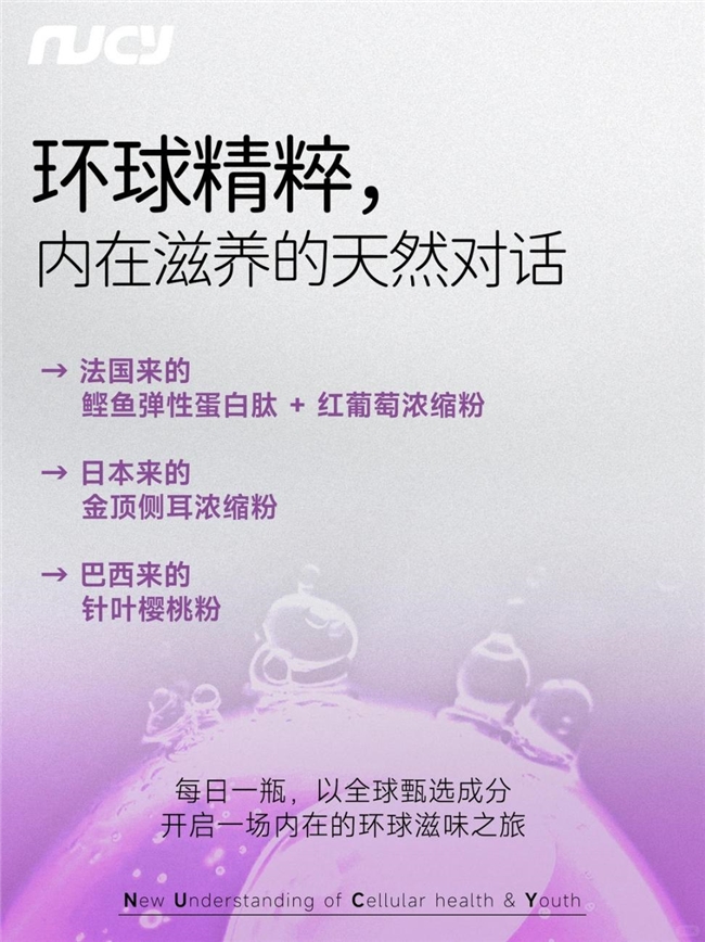 NUCY PQQ金顶侧耳胶原蛋白肽饮以科学的胶原流失数据为基础,通过精准的配方设计与科研级成分,构建起内在焕新的营养体系,为应对皮肤胶原流失提供了全面、安全的解决方案,也为功能性胶原饮品的研发提供了科学的参考范式。